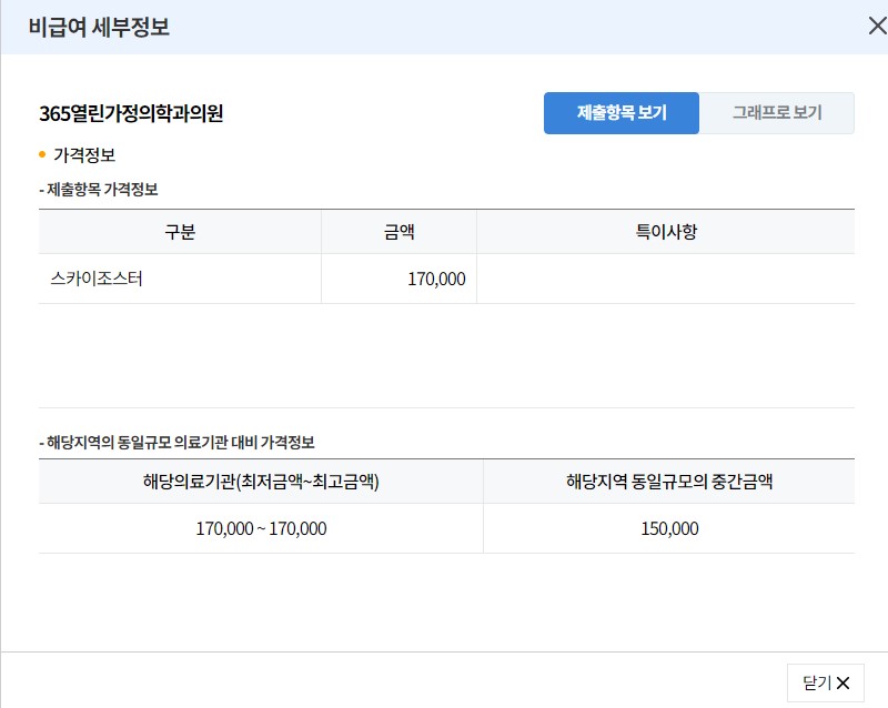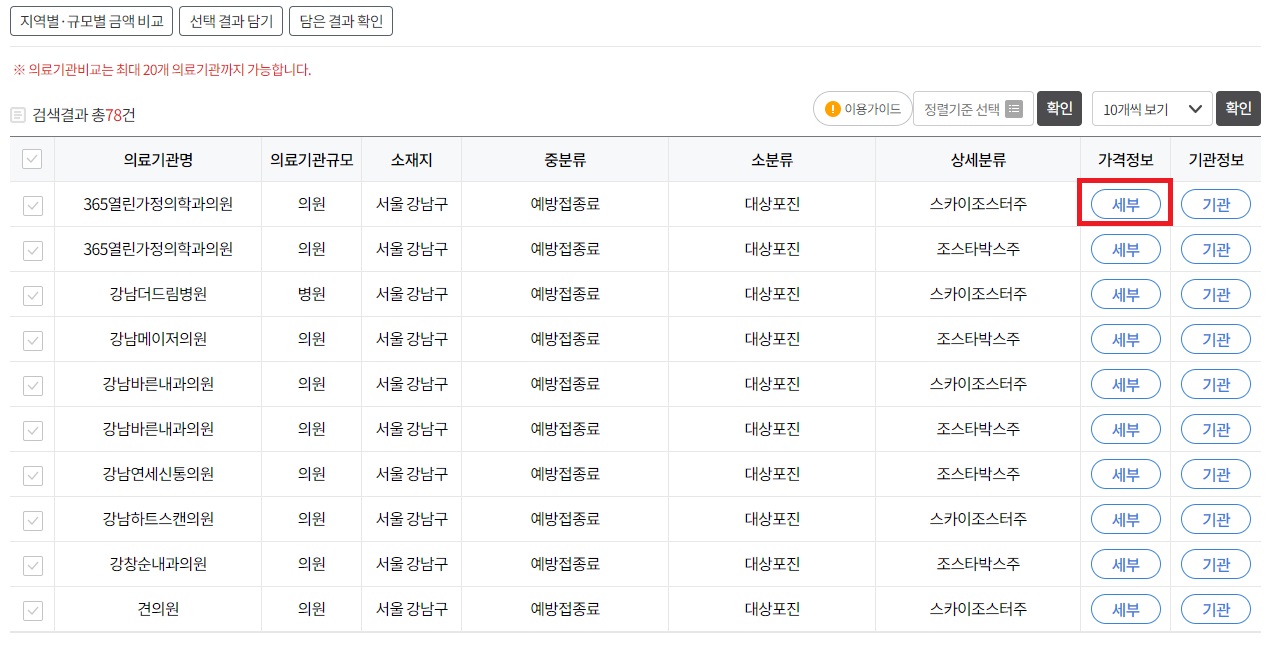 6) 검색결과를 확인하고 원하는 의료기관의 가격정보 [세부]를 클릭합니다.