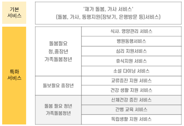 기본서비스(재가 돌봄, 가사서비스)와 특화서비스(병원동행, 심리지원, 교류증진 등)를 제공합니다.