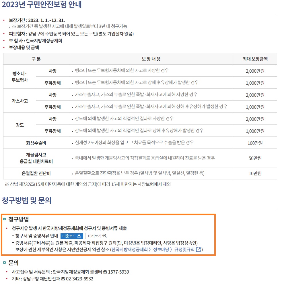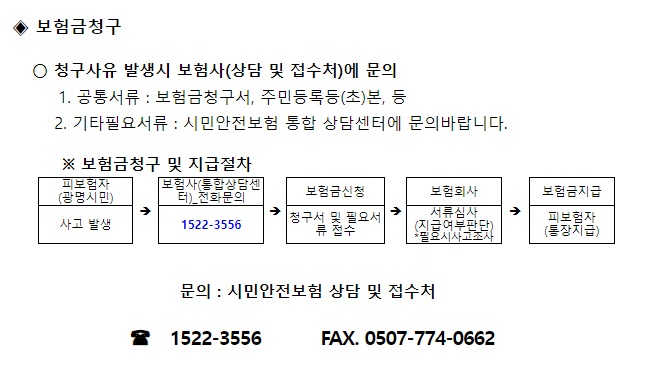 보험금 지급기준 및 절차는 지자체마다 다를 수 있으므로 거주지 지자체의 홈페이지에서 정확한 정보를 확인해 보시기 바랍니다. 보험금 청구 시 필요한 서류 또한 사고 상황에 따라 다를 수 있습니다.