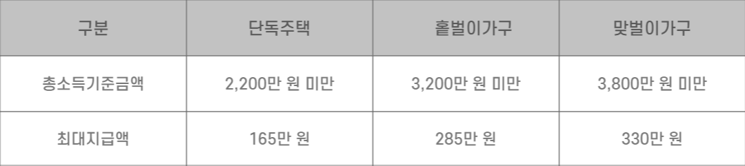 2) 2022년 및 2023년 부부합산 연간 총소득 합계액이 가구원 구성에 따른 총소득 기준금액 미만이어야 합니다.