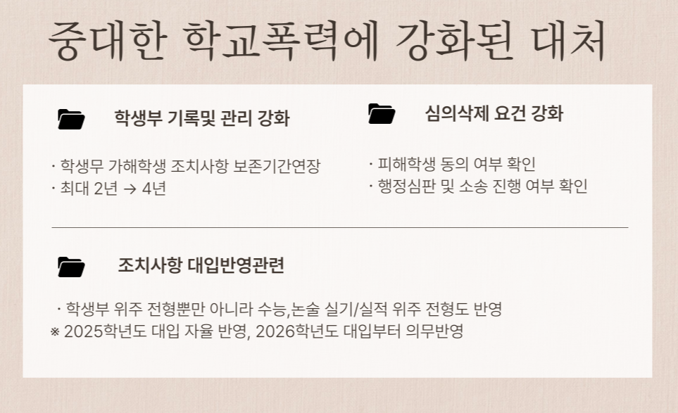 ✔️ 학교폭력 가해 학생의 생활기록부에 기재되는 학교폭력 조치사항 중 6호, 7호, 8호 조치의 보존기간은 가해 학생 졸업 후 4년간 보관됩니다.